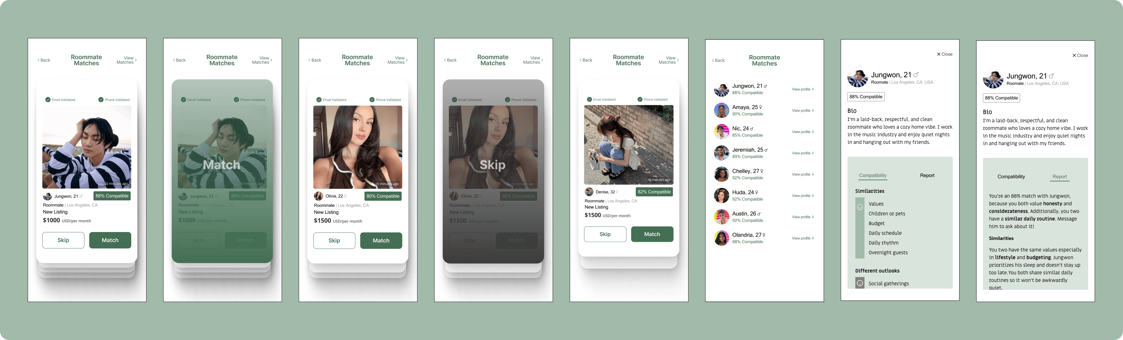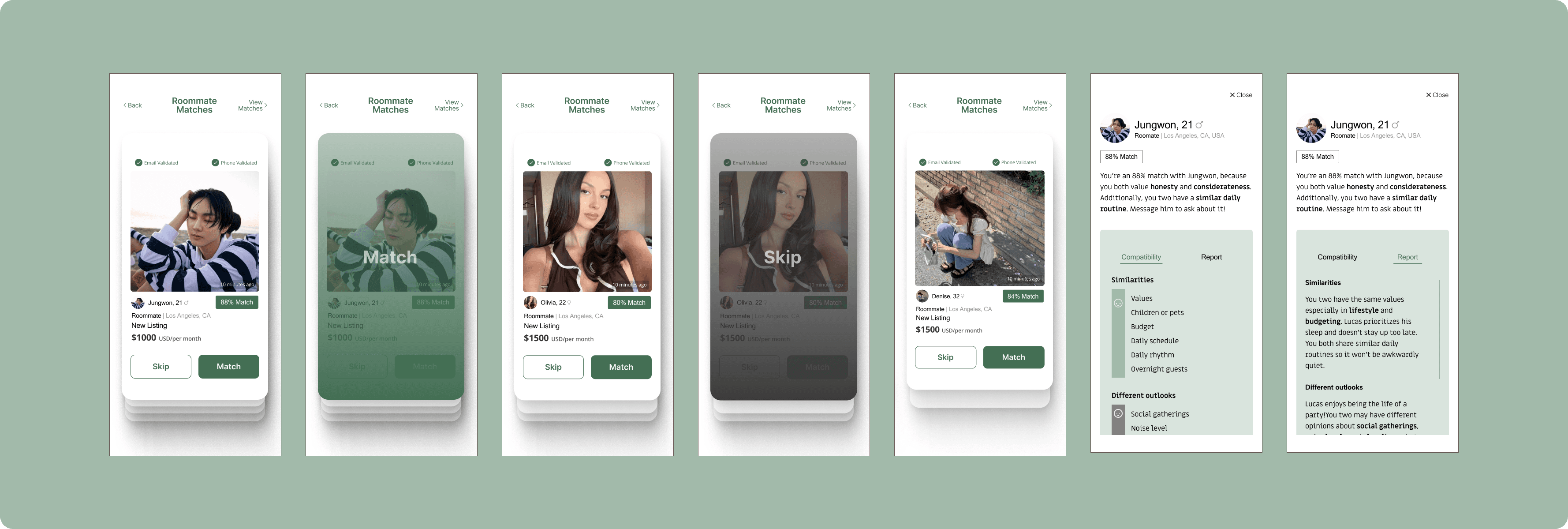 I designed a Compatibility Matching Feature integrated into the Roomster mobile app, a platform for finding roommates and available rooms, with the following goals in mind: