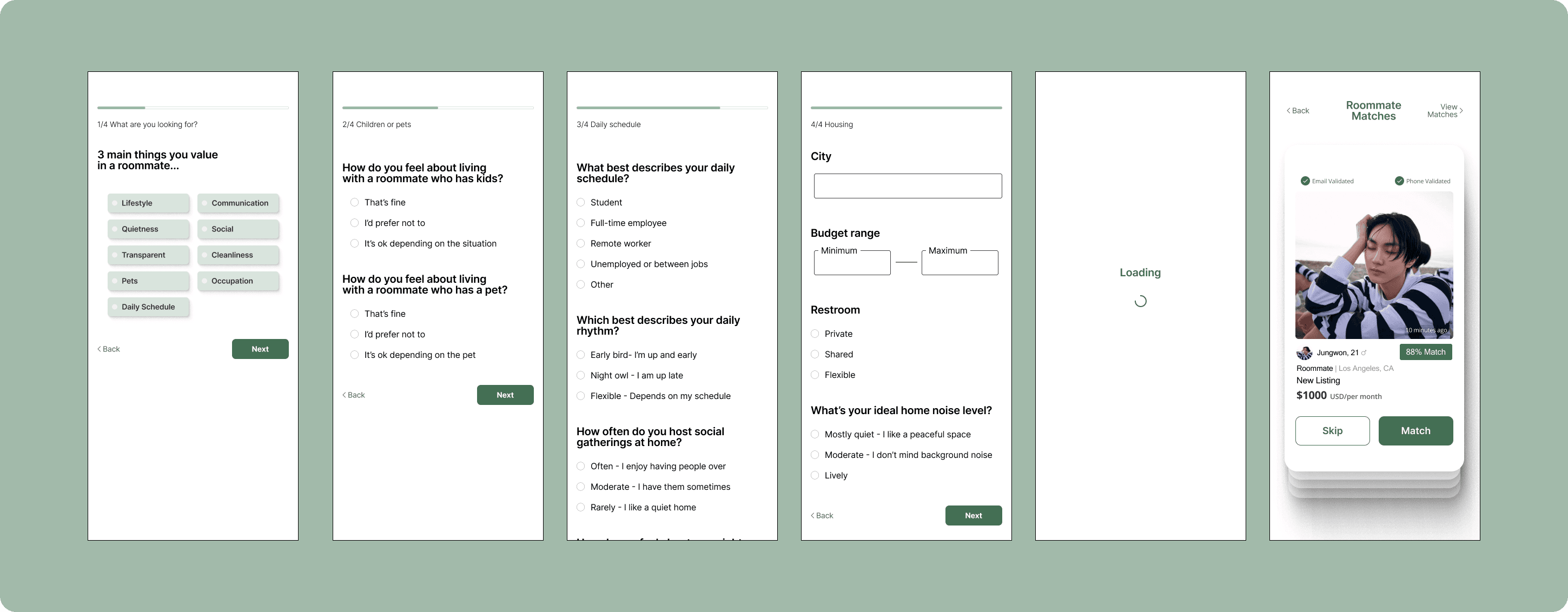 This design focuses on human-centric matching interface instead of property-centric listings when looking for a roommate. I focused on surfacing specific data points that users can identify as “deal breakers” during the interview phase.