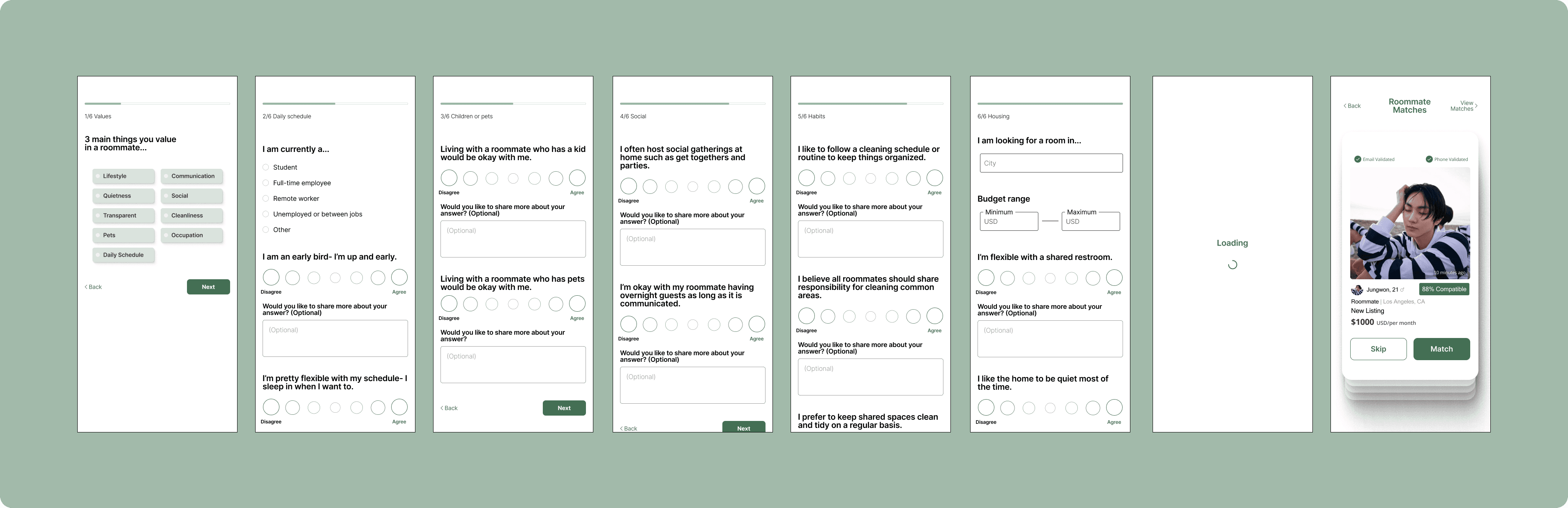 I developed a comprehensive question set designed to surface the specific lifestyle variables such as cleanliness and financial habits that my research identified as critical aspects when looking for a roommate. This curation of intentional questions was specifically aimed to uncover users’ habits as roommates that may not be mentioned in a standard bio in a user profile.