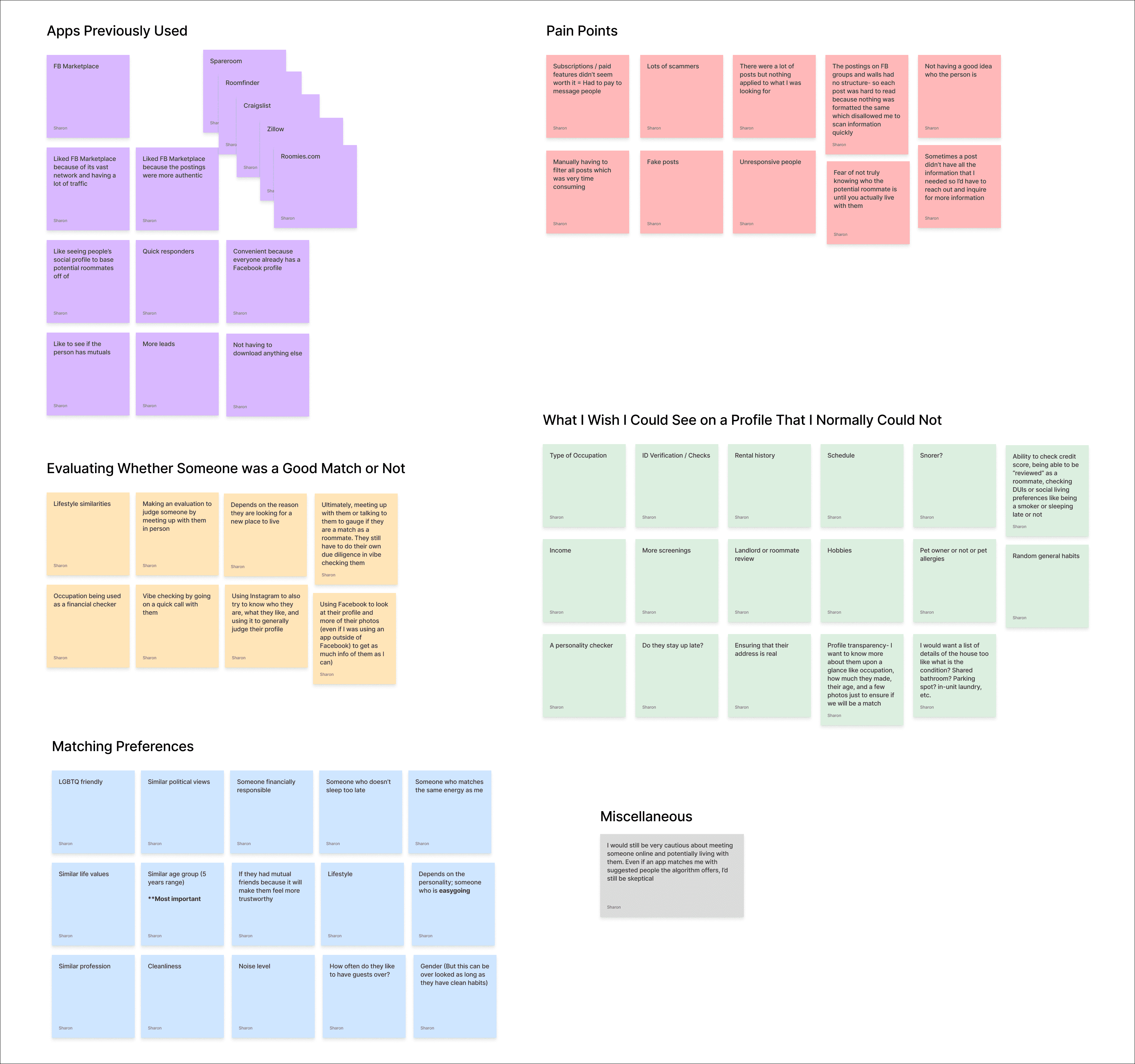 I conducted 7 user interviews with a group of participants who were roommate seekers and property owners, looking to share a home. My goal was to uncover their pain points and explore how they navigated the housing market and evaluated potential roommates.