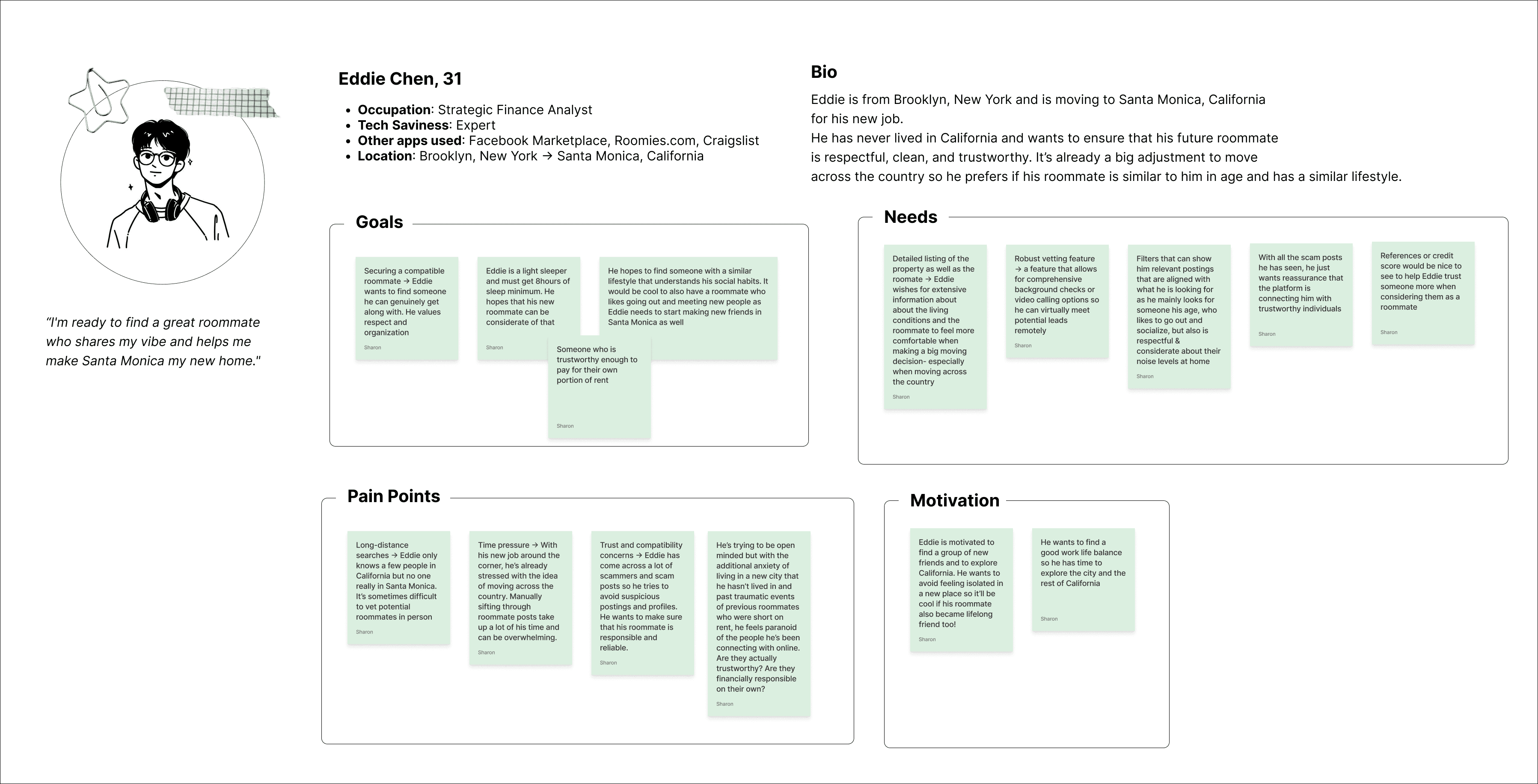 Everyone wants a “good” roommate, however, the user interviews revealed that their motivations and deal-breakers varied based on their current life stage. I identified the main archetype to represent the primary users of the Roomster Compatibility feature: The Lifestyle-Driven Connector.