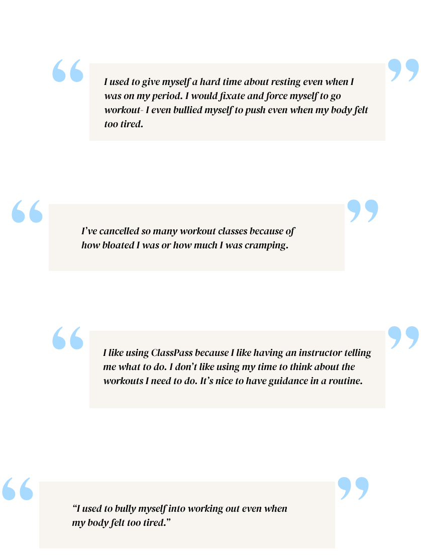 I divided the user interview questions into understanding users’ fitness habits and how their menstrual cycles impact their fitness.